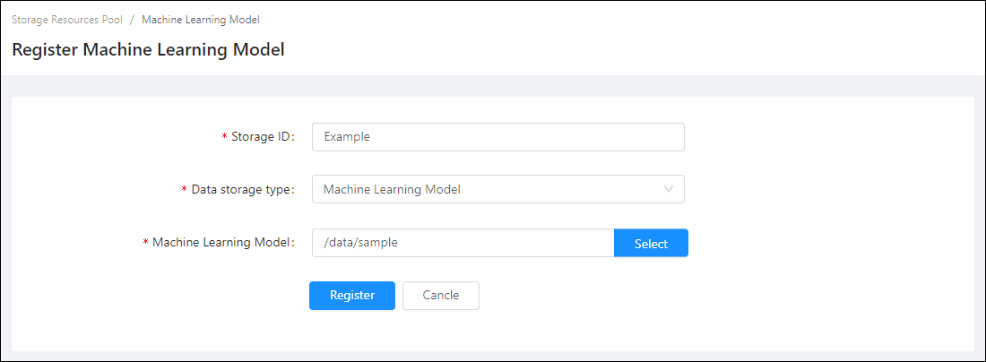 - Storage ID(Required): The name of the Machine Learning Model, the name is customizable.